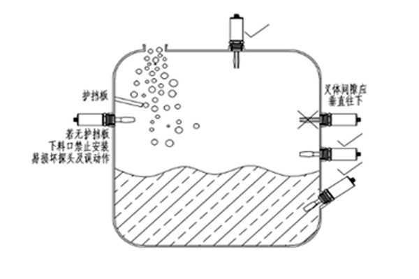 1、正確安裝方式:A.頂部安裝,探頭垂直向下,可安裝在頂部(遠離進料口)的任何位置;